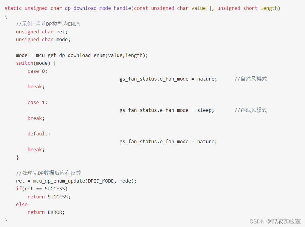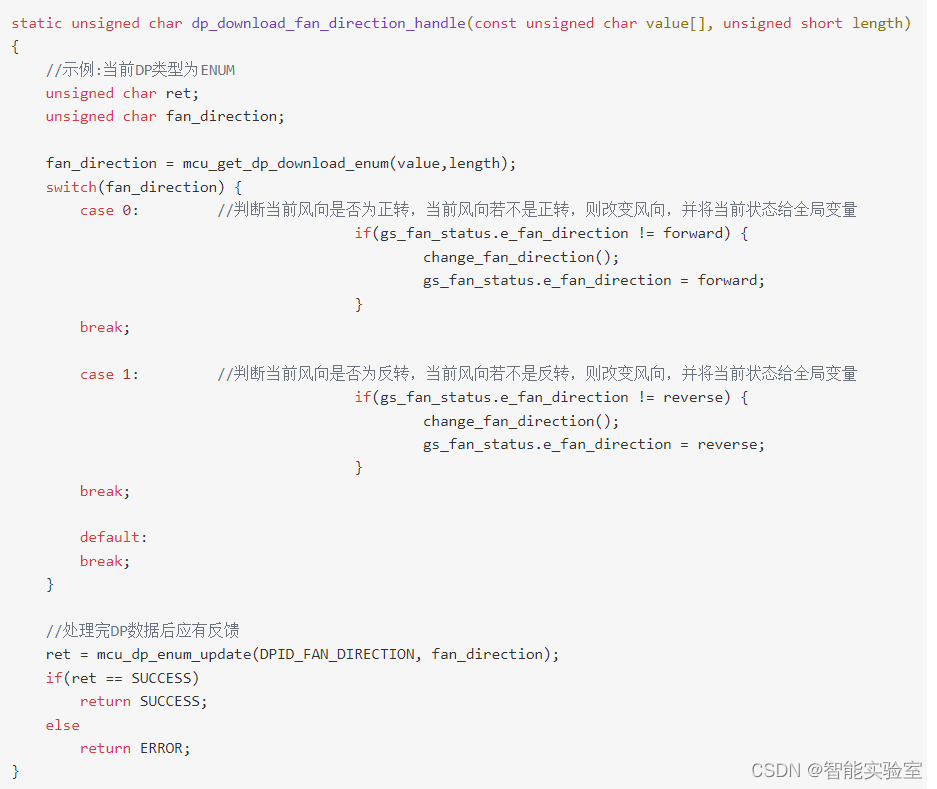 在 protocol.c 文件中,完善 dp_download_switch_handle (),dp_download_mode_handle (),dp_download_fan_speed_handle () 和 dp_download_fan_direction_handle () 这四个功能处理函数。