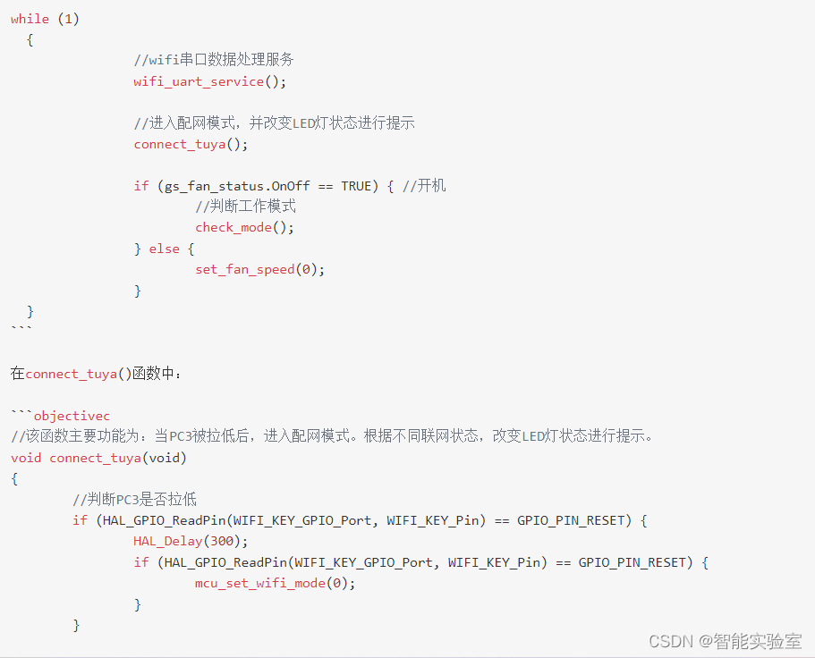 软件开发过程主要基于 Keil5 实现 MCU 与传感器和模组协议对接。首先调通 MCU 和模组的通讯,可以实现 App 配网,MCU 数据传输到 App。