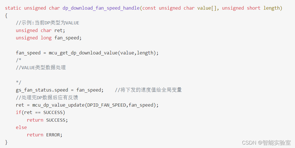 在 protocol.c 文件的 dp_download_fan_speed_handle () 函数中: