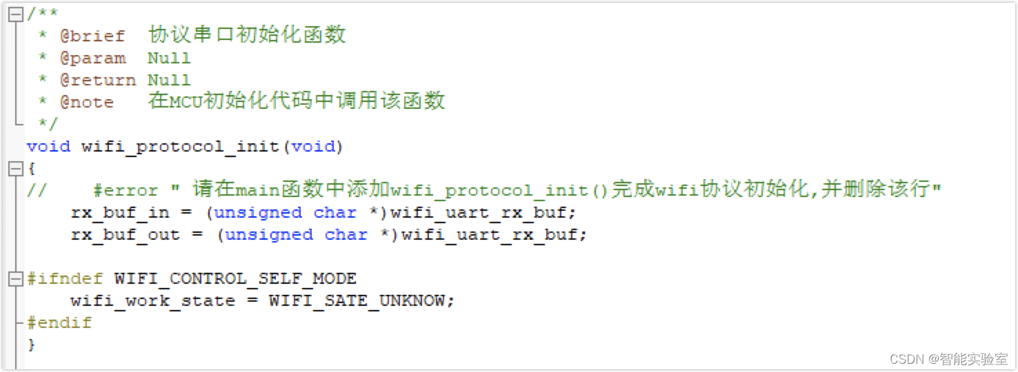 6、将 wifi_protocol_init() 函数按照#error 中的提示信息处理,处理后注释掉。