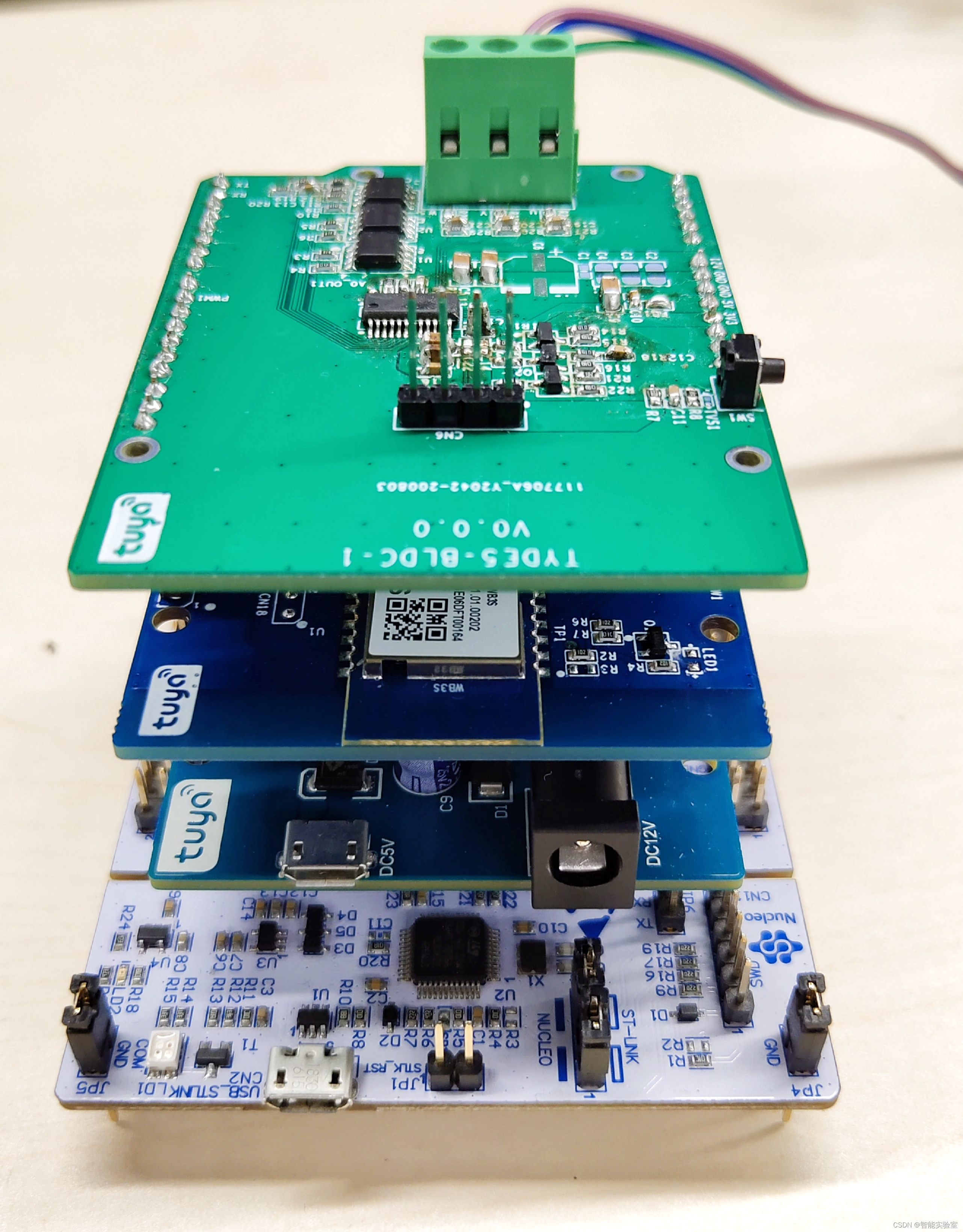 注意:虽然 BLDC 功能板支持串口,按键和 PWM 控制,但是 MCU 控制板和 Wi-Fi 通信板通过右下角串口通信,为了减少对 BLDC 控制的影响,该功能板默认是只支持 PWM 控制的。
