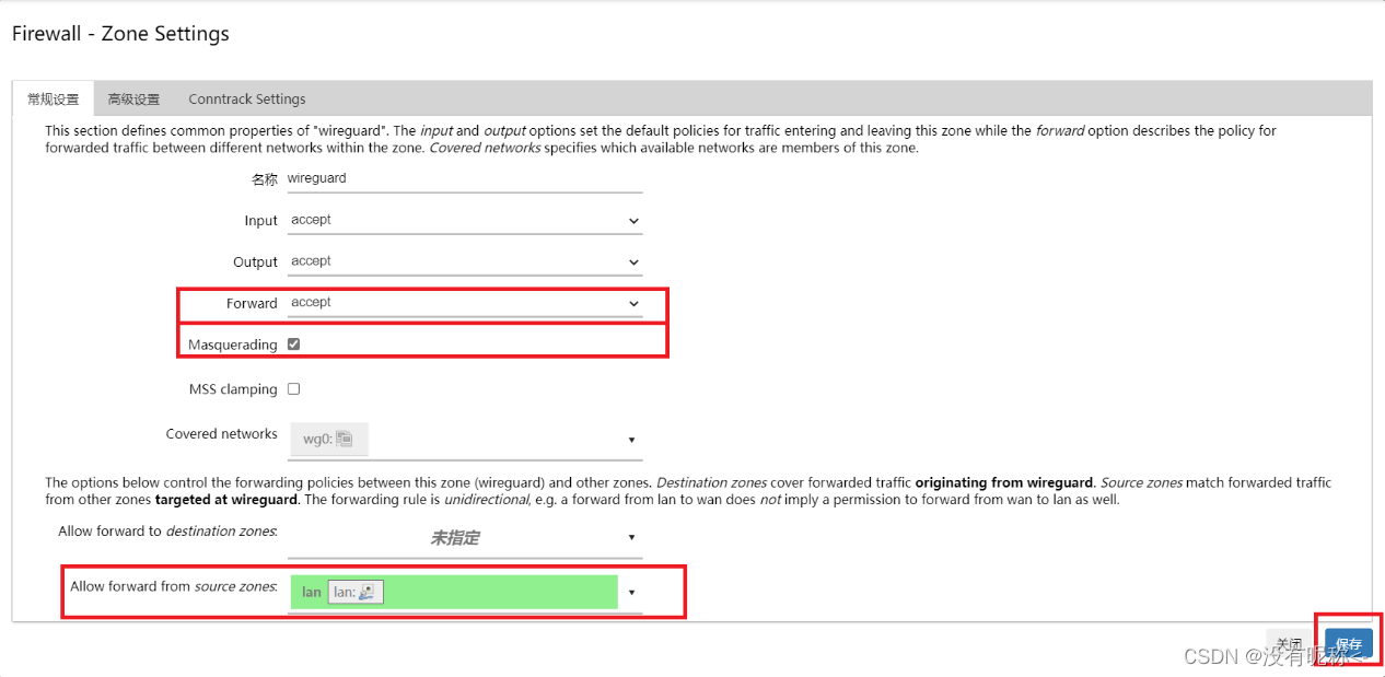 在 “Firewall – Zone Settings” 窗口的 “常规设置” 选项卡中,将 “Forward” 设置为 “accept”,并勾选 “Masquerading”。在 “Allow forward from source zones” 中,选择 “lan” 区域,这样将允许lan内的数据包转发至WireGuard区域,实现OpenWrt下的设备与WireGuard区域通信。