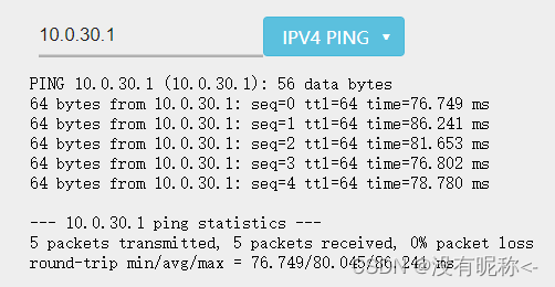 在 “网络诊断” 页面的 “IPV4 PING” 测试处,输入WireGuard局域网网关10.0.30.1,如果数据包成功发送和接收则表明接入WireGuard局域网正常。