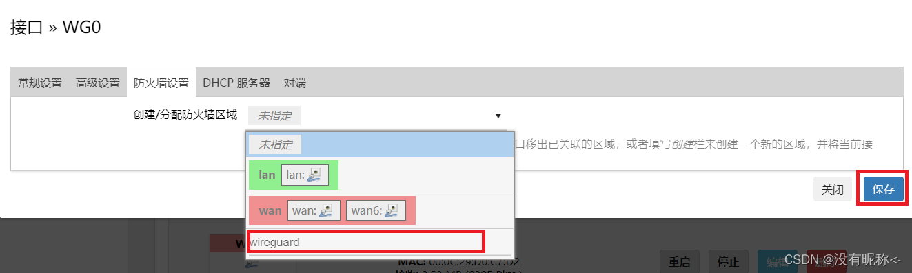 在 “创建/分配防火墙区域” 中,自定义创建一个新的防火墙区域,本实验命名为 “wireguard”,输入完后回车即可。点击 “保存” 按钮完成配置。