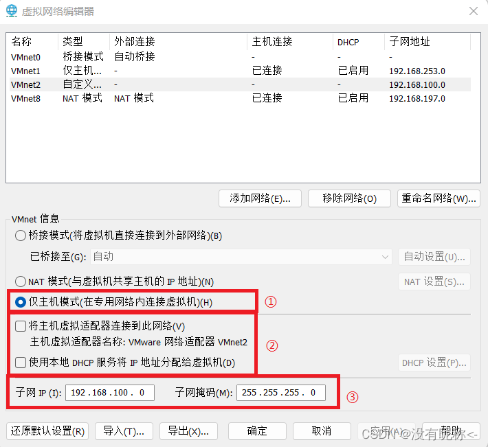 ① 在VMware菜单中,点击 “编辑->虚拟网络编辑器”,点击右下角 “更改设置”,为其提供管理员权限。在虚拟网络编辑器中,点击 “添加网络”,选择一个未被使用的网络(如VMnet2),按下图配置该网络,并指定网段(如192.168.100.0/24)。
