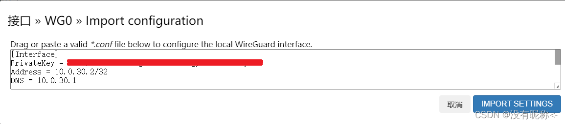 接口创建完后,弹出新的窗口 “接口 >> WG0”,进一步配置WireGuard接口。