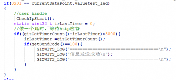 因硬件还没搭接,所以我将上述代码加在int8_t ICACHE_FLASH_ATTR gizwitsEventProcess(eventInfo_t *info,uint8_t *data, uint32_t len)中