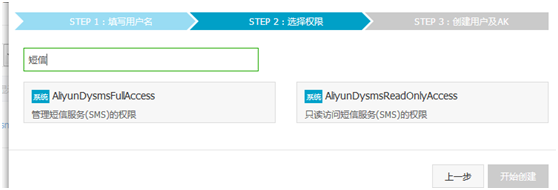 2.4、选择权限管理短信服务(SMS)的权限(搜索短信),下一步