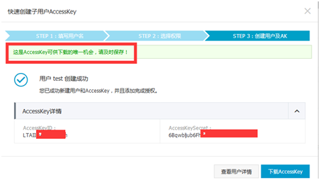 注:AccessKeySecret只在本步骤才能看到,以后也查不到,请将这个文件下载下来好好保管。
