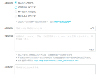 3.3、点击“产品使用”->“短信模板”->“添加模板”,按要求填好后等待阿里审核