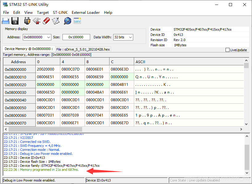 我用时21秒,是因为固件比较大,一个2.4M多的固件,哈哈,不清楚为啥偏偏它辣么大。可以看到烧录速度是 4MHz,这个速度可比用uart的方式快多了。