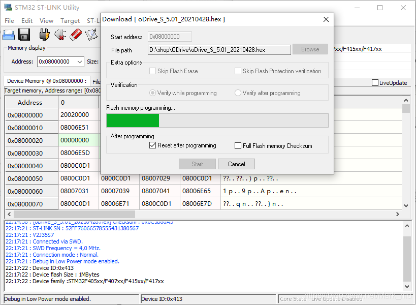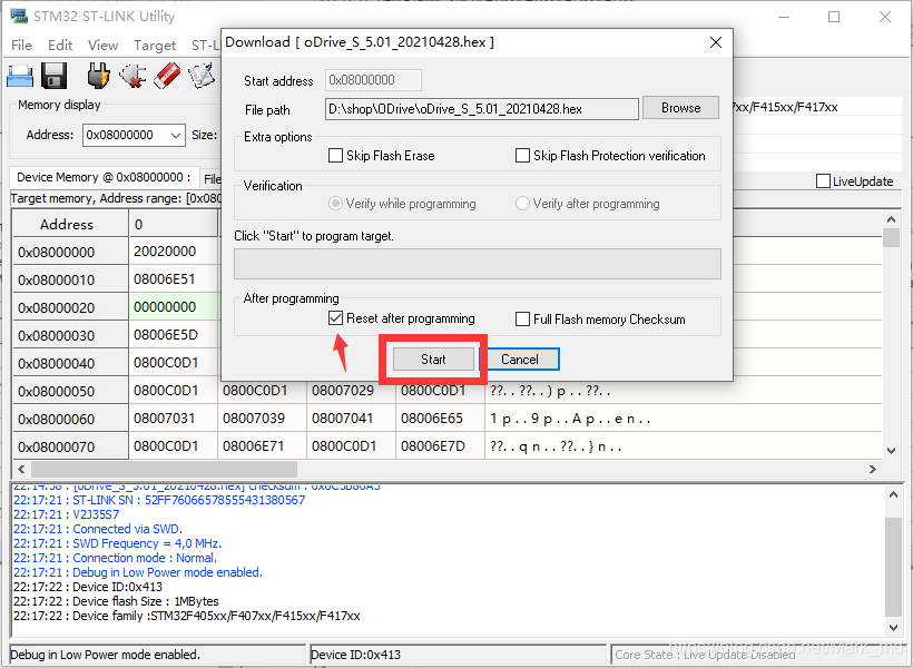 确认文件信息一致,默认会将 烧录后复位 勾选上。点击 Start 正式开始烧录。