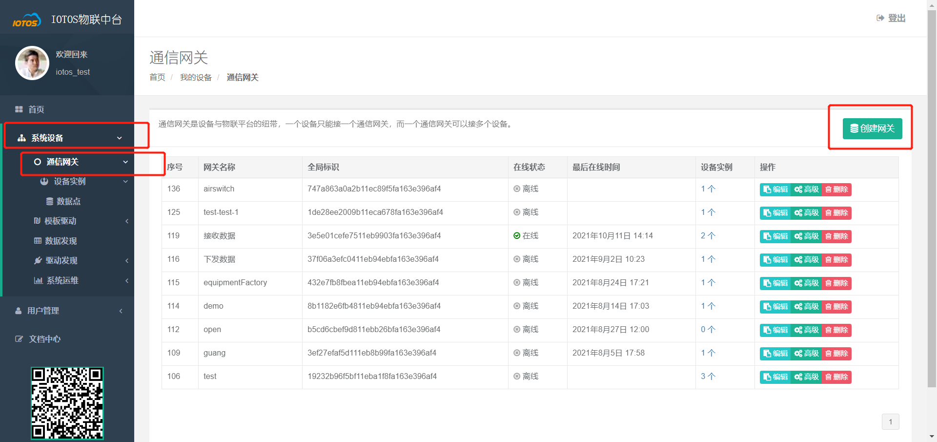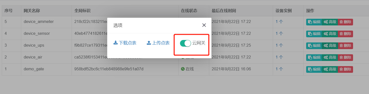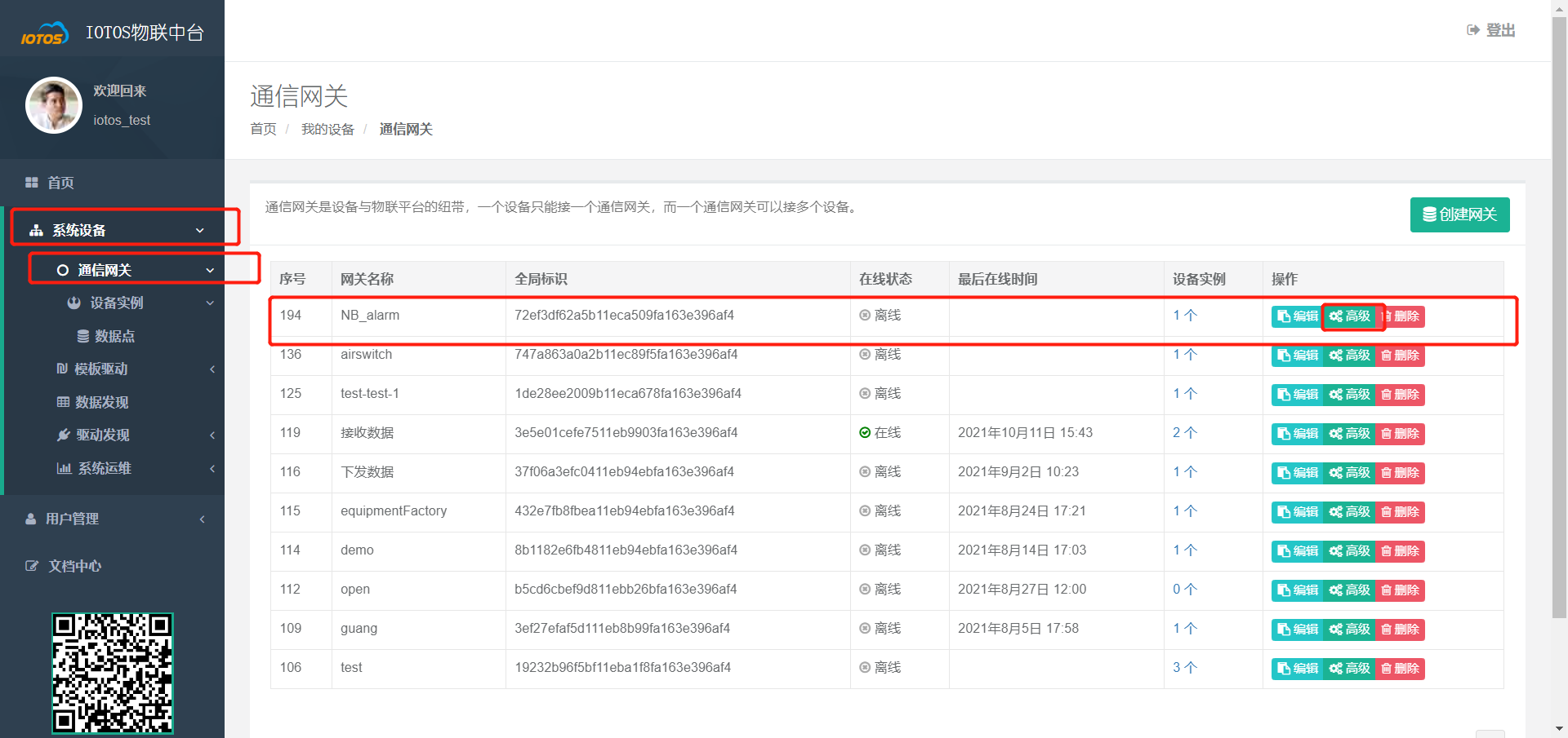 - 在【系统设备】 -> 【通信网关】中找到刚才创建的网关,点击【高级】