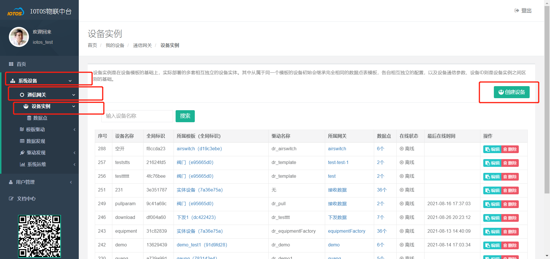 - 创建设备示例点击【我的设备】 -> 【通信网关】 -> 【设备实例】->【创建设备】