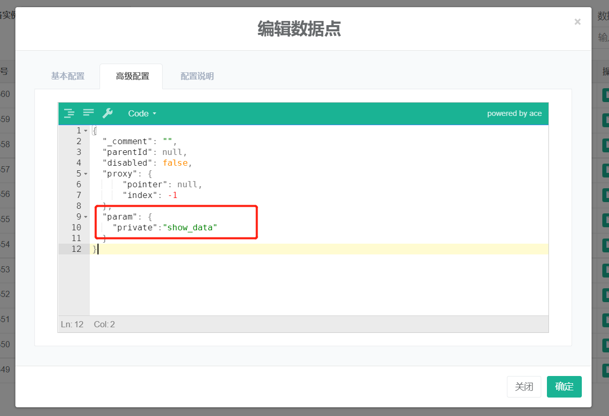 - 并在高级配置中配置数据点的相关标志,“参考信号接收功率 ”,“燃气检测状态 ”,这两个为接收数据的两种数据类型的第一个点,配置"private"属性用于驱动识别,分别配置为show_data,gas_event,例如“参考信号接收功率”这个点的配置: