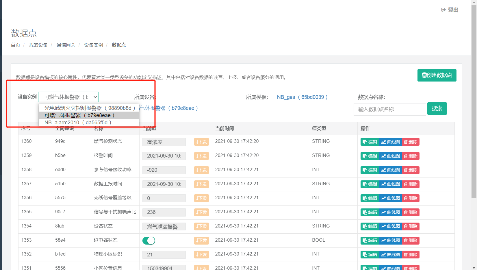 - 点击 【系统设备】 -> 【通信网关】 -> 【设备实例】->【数据点】,选择刚才创建的设备实例