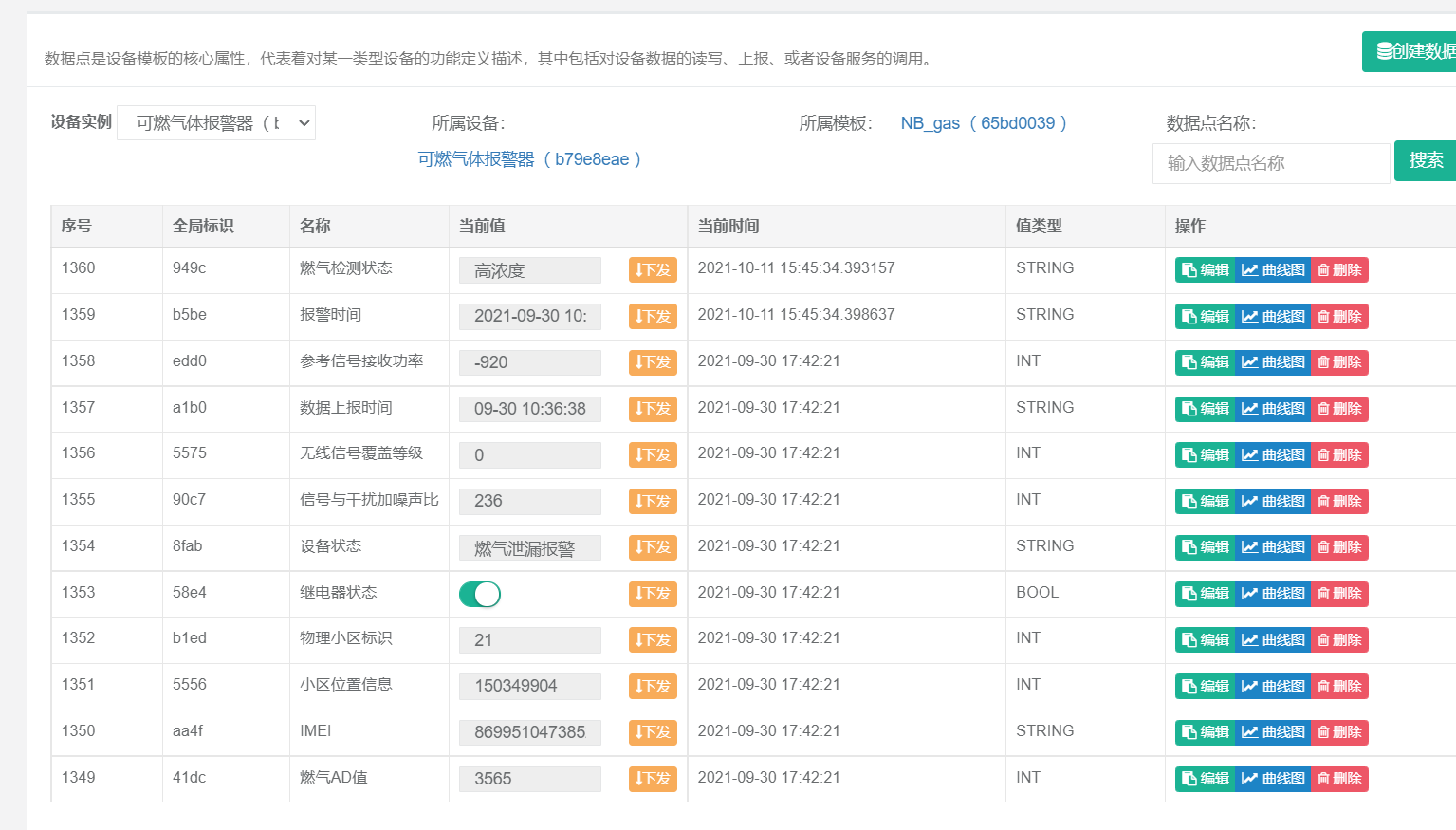 - 创建数据点,点击【系统设备】 -> 【通信网关】 -> 【设备实例】 -> 【数据点】,并在【设备实例】下拉列表选择刚刚创建的设备实例
