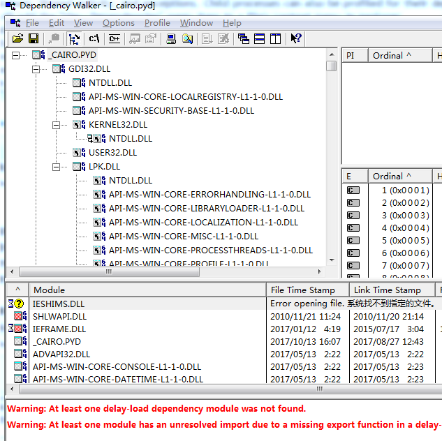 这里给大家推荐一个好用的依赖检测工具,其他的python扩展包也同样适用:http://www.dependencywalker.com/,下载系统对应版本,解压缩直接运行即可,在depends.exe内打开你下载安装的包的pyd文件,例如刚才下载的pycairo库(应该在你pip对应的python安装目录Lib\site-packages\cairo内):