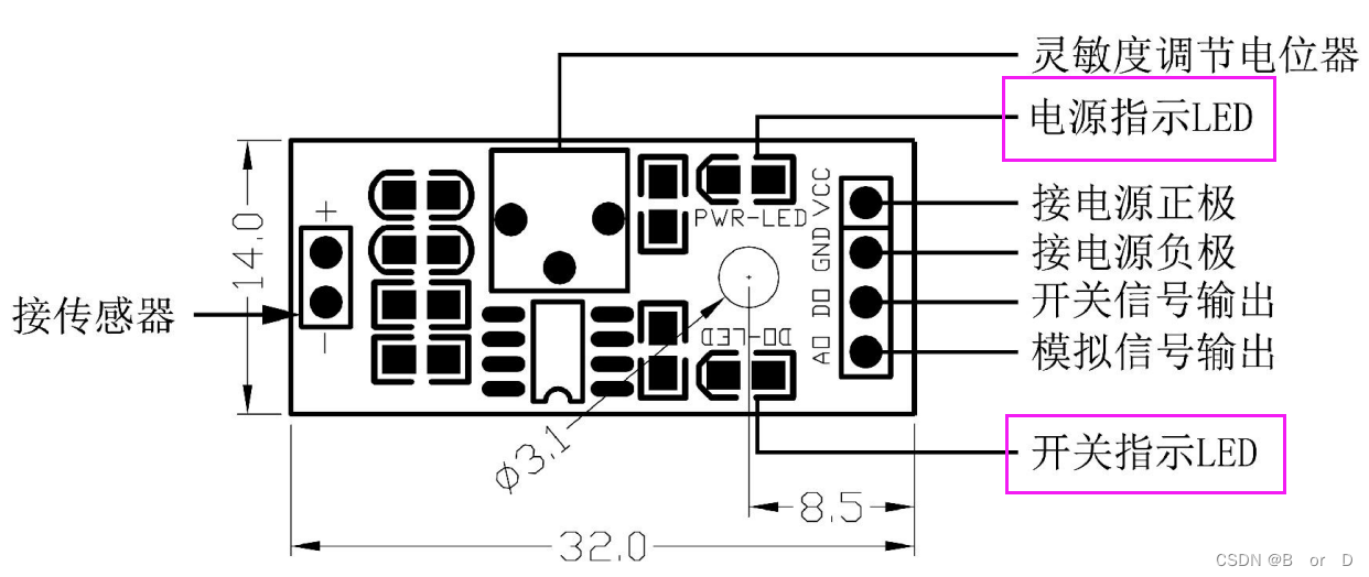 电位器是用于土壤湿度的阀值调节,顺时针调节,控制的湿度会越大,逆时针越小,通过电位器调节土壤湿度阈值,当土壤湿度低于设定的阈值时,模块输出高电平,高于设定的阈值时,模块输出低电平。