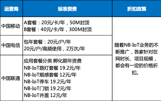 国内三家运营商非常重视NB-IoT网络建设投入,中国移动、中国电信在城市范围基站部署数量相当,并不断的加强网络服务质量。在用户比较关心的资费方面,三家运营商NB-IoT业务的标准资费大体相当,根据在网时长、项目规模都会给予一定折扣,短期内不会出现运营商的价格战,各家在定价策略上略有不同。