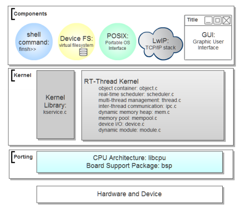 • 硬实时内核kernel,这层是RT-Thread的核心,包括了内核系统中对象的实现,例如多线程及其调度,信号量,邮箱,消息队列,内存管理,定时器等实现。