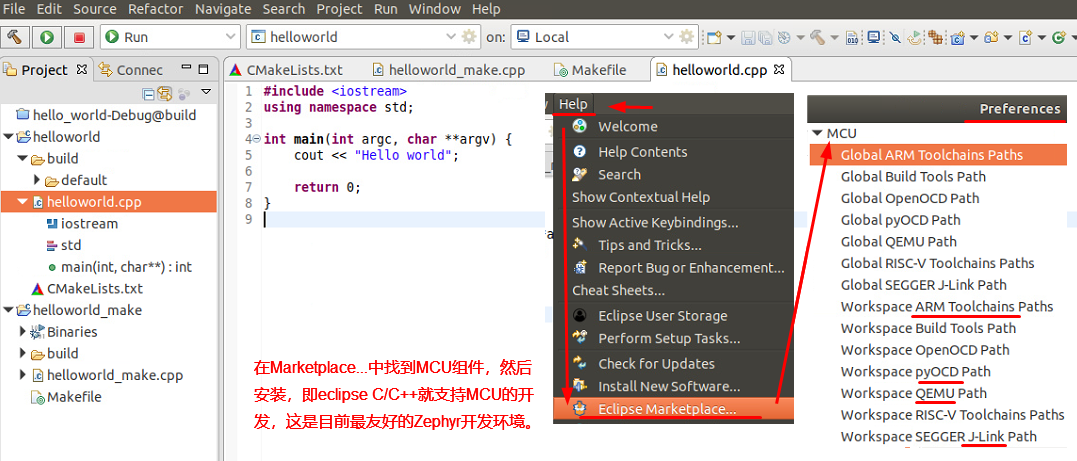 (2)好的IDE能使学习事半功倍,当前主流的Zephyr的开发环境是用visual studio code或者eclipse来搭建,我使用eclipse来搭建,只是个人习惯,不过,CMake支持把Zephyr项目构建为支持Eclipse的Prj。如下图所示,是我用eclipse mcu作为Zephyr的具体项目的集成IDE。