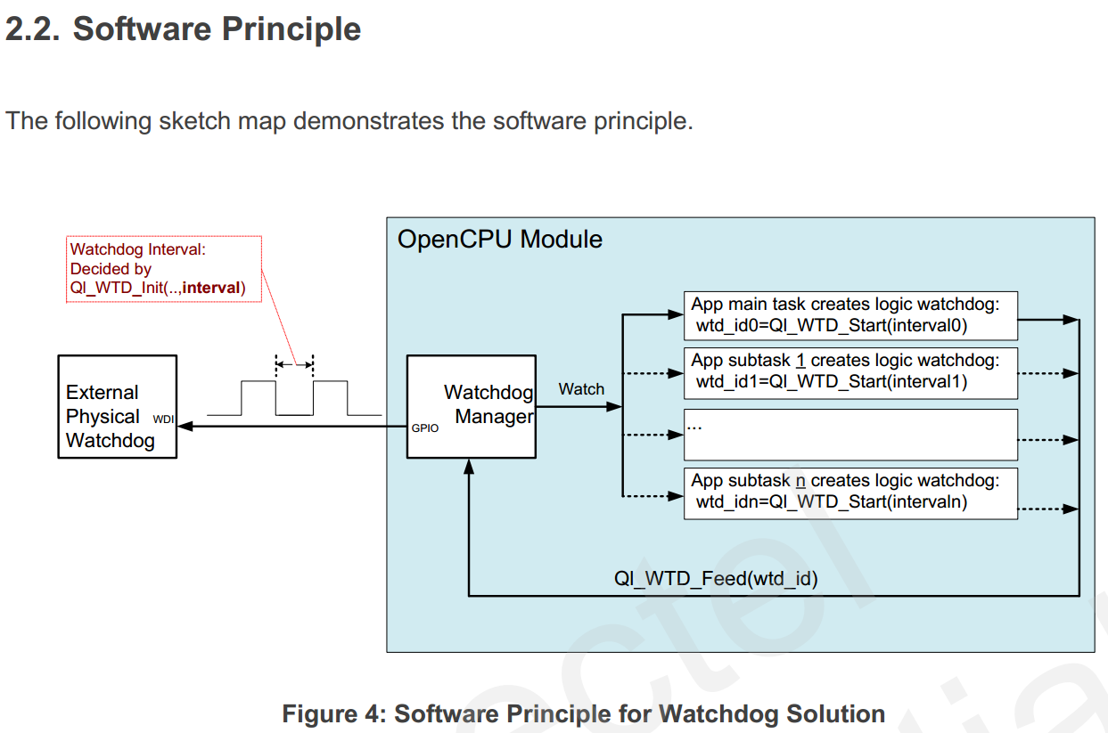 其实,移远M26 OpenCPU自带看门狗管理器,可以使用其内部看门狗管理器来进行喂狗,软件实现的原理如下图: