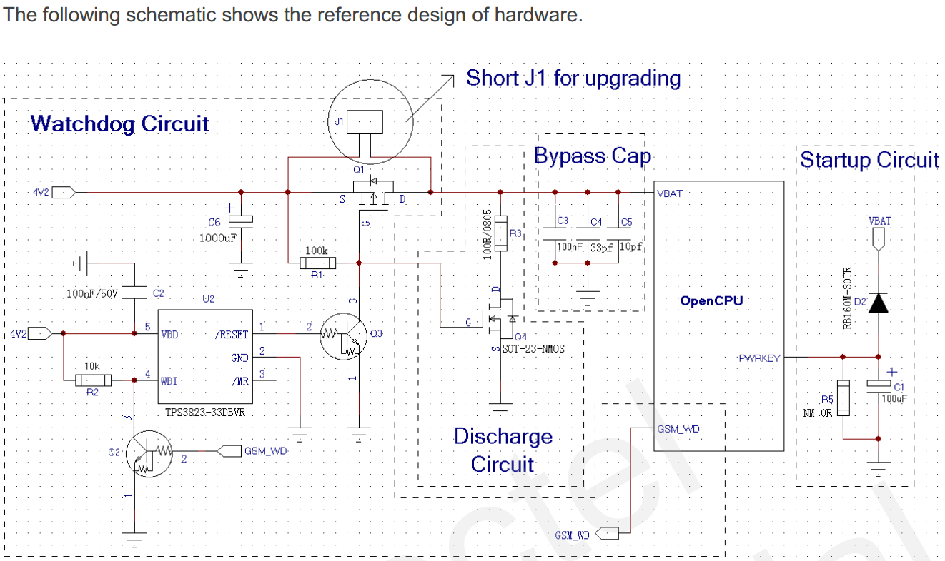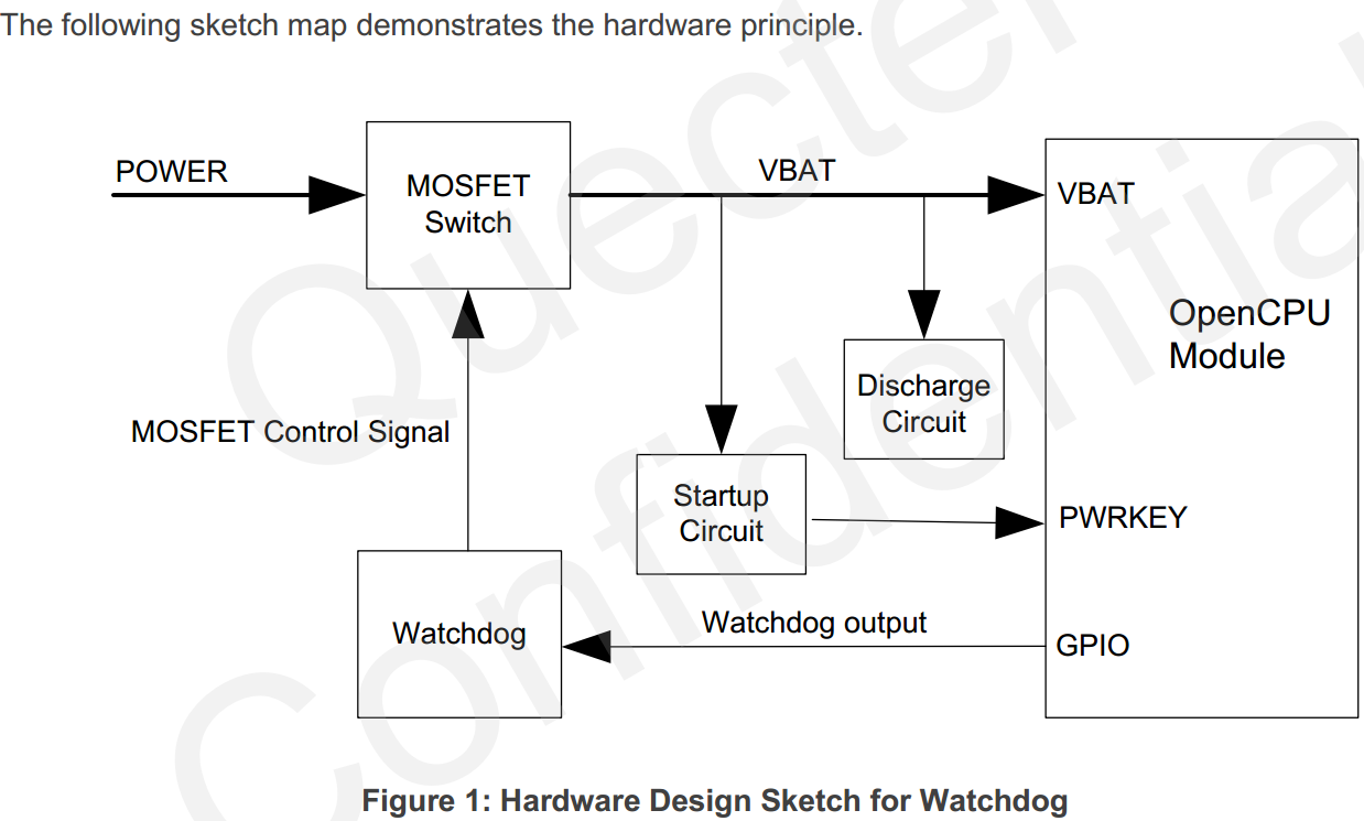 之前在物联网-移远M26模块OpenCPU开发第1讲中提到过需要给外部看门狗芯片喂狗才能正常工作,阅读过的读者应该知道,我是通过周期性的控制M26的一个GPIO引脚电平变化来实现喂狗的。关于其硬件参考设计如下图: