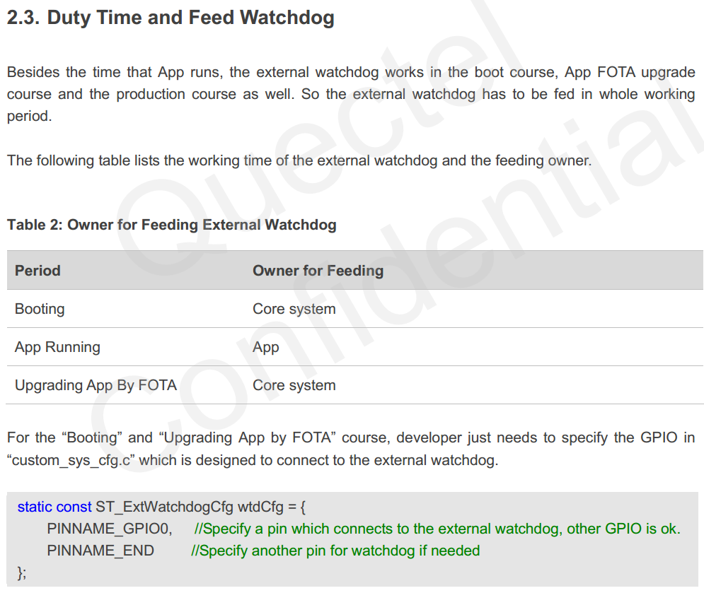 除了执行用户应用期间的喂狗,还可以在芯片启动时和远程升级软件时主动喂狗(没有验证过,后期会试一下远程升级软件功能),如下图: