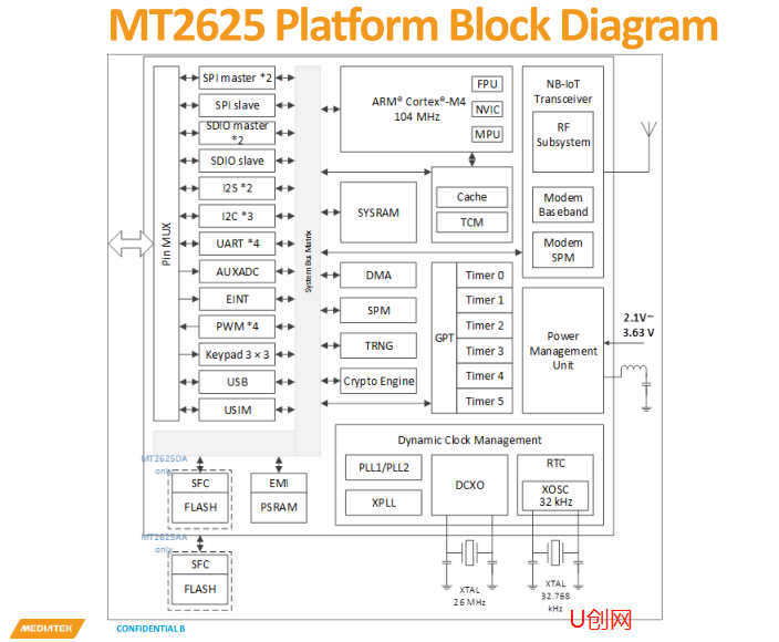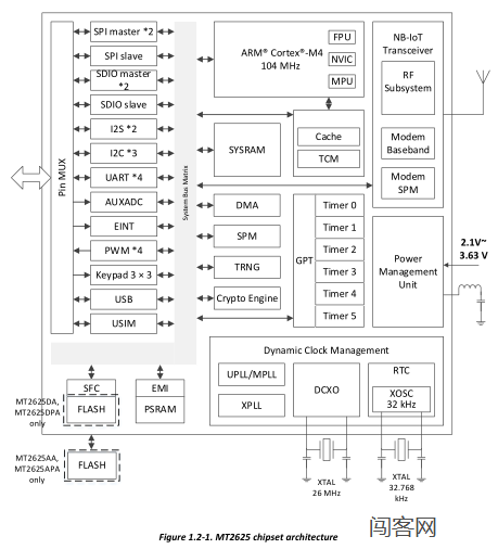 mt2625是基于手臂的,带有浮点微控制器单元(闯客网),与4mb psram集成以及4mb闪存。mt 2625还支持包括uart,i2c,spi,i2s,pwm,sdio,adc,usb,