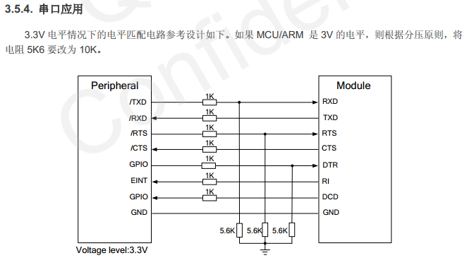 可能是由于设计者经验不足的原因吧。我刚拿到板子的时候一看,心想坏了。貌似串口没有进行电平匹配,找来原理图纸一看,还真的没有进行电平匹配。呵呵,这个时候我还能说啥,自己搭电平匹配电路吧。我又打开了M26 OpenCPU硬件参考手册,找到串口设计章节,如下图: