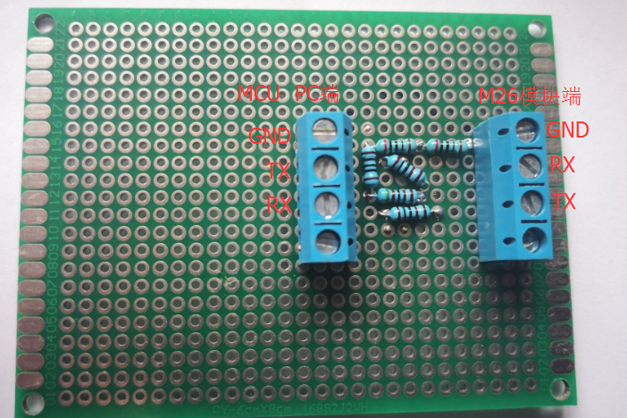 接下来我就将M26电路板上的串口引脚引出来连接至自制电平匹配电路板上,效果如下:
