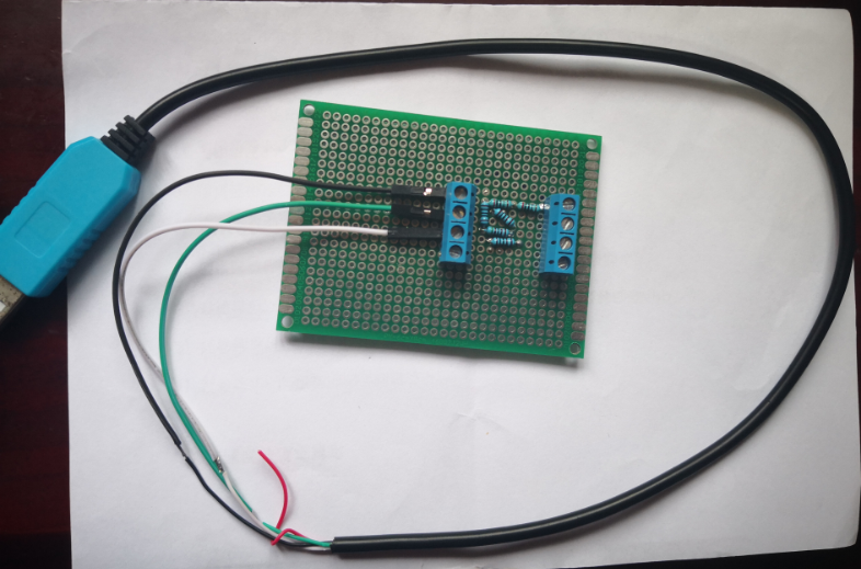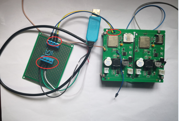 由于使用的是笔记本电脑开发,所以找来一根以前工程使用剩下来的USB转TTL线,与自制电平匹配电路板连接起来,如下图: