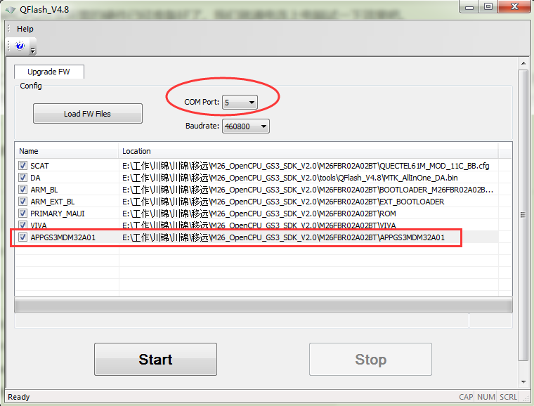 打开QFlash 4.8烧录软件,选择好串口号和烧录文件,如下: