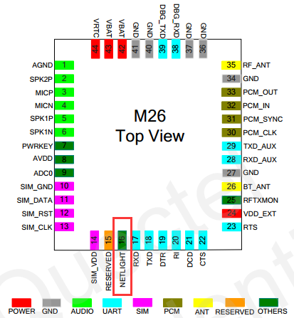 从上图可知喂狗的引脚连接的是M26的16号引脚,通过引脚图可知是NETLIGHT引脚。如下图: