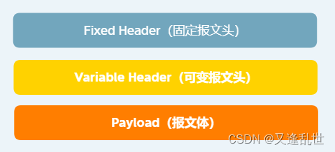 在MQTT协议中,一个MQTT数据包由:固定头(Fixed header)、可变头(Variable header)、消息体(payload)三部分构成。MQTT数据包结构如下: