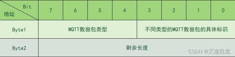 1. 固定头(Fixed header)。存在于所有MQTT数据包中,表示数据包类型及数据包的分组类标识,如连接、发布、订阅、心跳等。其中固定头是必须的,所有类型的MQTT协议中,都必须包含固定头。