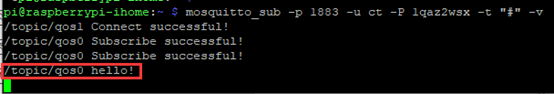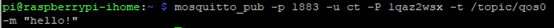 mosquitto_pub -p 1883 -u ct -P 1qaz2wsx -t /topic/qos0 -m "hello!"