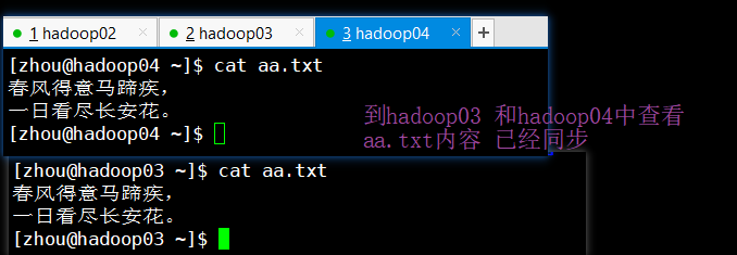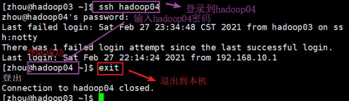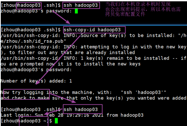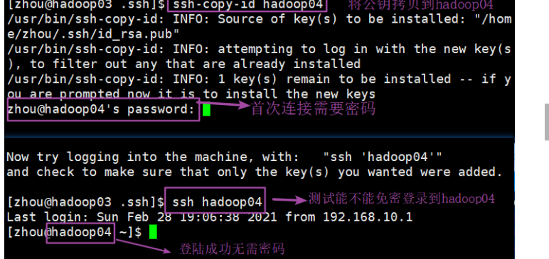 还需要在另外两台机器上采用账户zhou配置免密登录到hadoop02 hadoop03 hadoop04上,重复刚才的操作即可