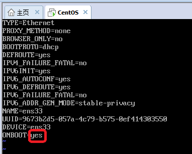 进入【ifcfg-ens33】文件后,修改文件,按【i】,进入文件编辑模式,将【ONBOOT=no】改为【ONBOOT=yes】