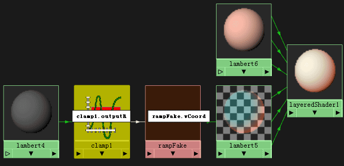 再建立一个Lambert和Clamp,在Hypershader窗口中用中键把新建的Lambert拖到Clamp节点,使Lambert的OutColor和Clamp的Input节点相连,Clamp的Min和Max调节如图