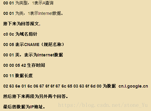 查询名为要查找的名字,它由一个或者多个标示符序列组成,每个标示符已首字符字节数的计数值来说明该表示符长度,每个名字以0结束,计数字节数必须是0~63之间,该字段无需填充字节,如:gemine.tuc.noao.edu