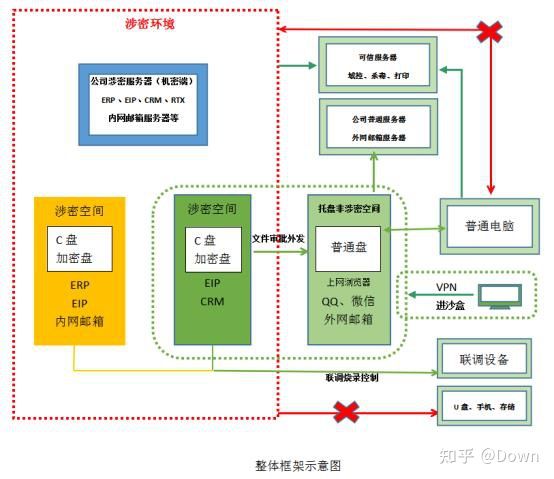 黄区:一般产品技术平台的规划、设计、开发、文档、测试环境等,有独立的网络环境,文件到红区只能通过单项FTP,到绿区走EIP权限控制,黄区可通过远程桌面文件隔离方式访问绿区,访问业务系统有ERP、EIP、内网邮箱、UCA、云桌面等;
