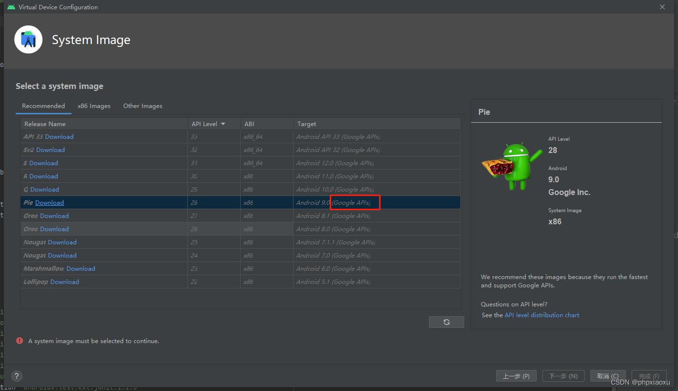 4. 使用Android Studio 模式器 (注意!!注意!!注意!!系统要选择 没有 Google Paly的 镜像,可以使用有Google APIs 的镜像) 如下图所示: