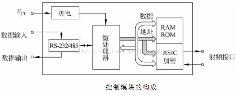 控制模块由ASIC组件和微处理器组成。微处理器是控制模块的核心部件。ASIC组件主要用来完成逻辑加密的过程,如对读写器与电子标签之问的数据流进行加密,以减轻微处理器计算过于密集的负担。对ASIC的存取,是通过面向寄存器的微处理器总线实现的。一般结构参昭下图: