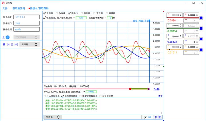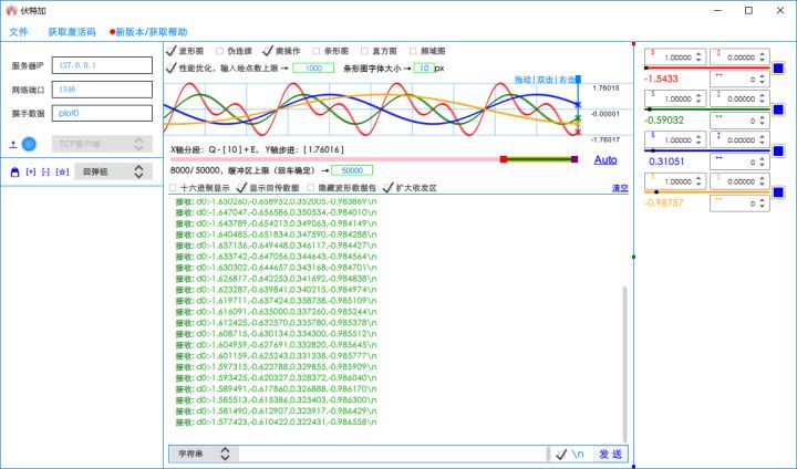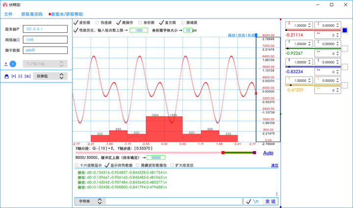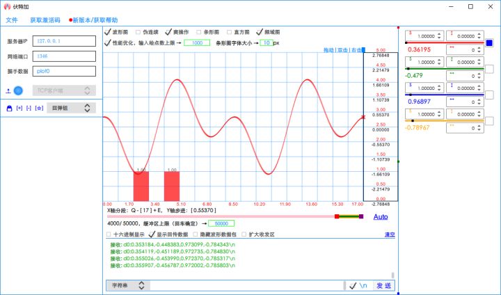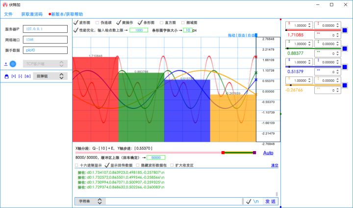 2. 能图形化(波形图、条形图)显示硬件发送的数据,并且图形可以随意放大缩小移动,能对数据进行简单分析(直方统计、频率分析),并且图形化显示。