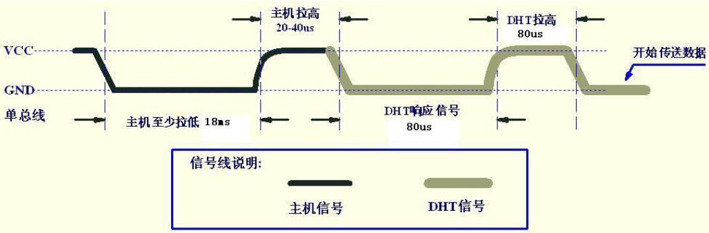 总线空闲状态为高电平,单片机把总线拉低等待DHT11响应,单片机把总线拉低必须大于18ms,保证DHT11能检测到起始信号。