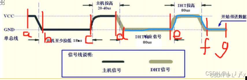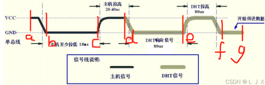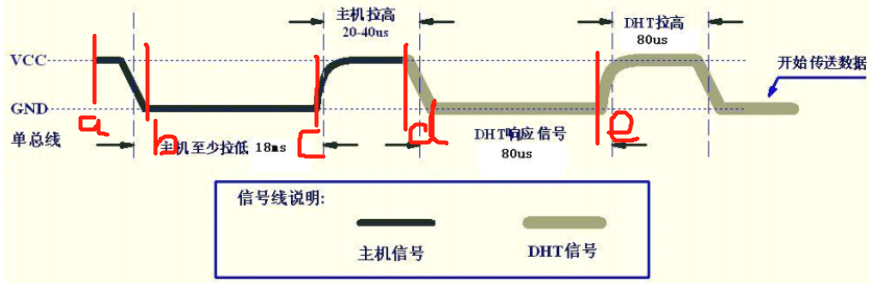 使用DHT11时,第一步单片机必须要根据图中所给的时序给DHT11发送一段信号,DHT11接收到单片机发来的信号后才可以进行后续的工作。图中的主机信号也就是单片机给出的信号,单片机在开始的时候需要在a点拉高,然后再b点拉低至少18ms(不放心的话也可以再拉长一点),在c点再变回高电平持续20-40us到了d点。单片机给dht11的初始化信号就发送完毕了。单片机发送完成后,dht11也会随之响应,由时序图可以看出dht11有一段80us的低电平,我们可以利用这一段低电平来检测dht11模块是否存在,也可以判断出来你的模块是否损坏,以免后续因为模块损坏的问题查找半天错误,得不偿失。