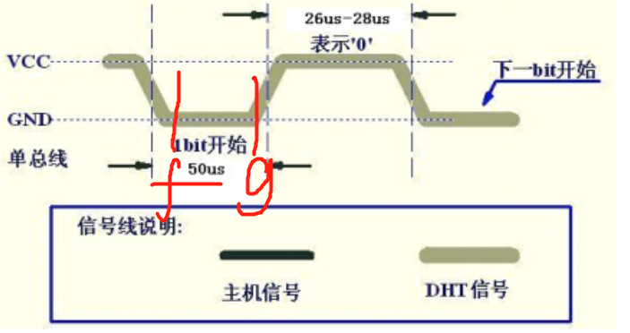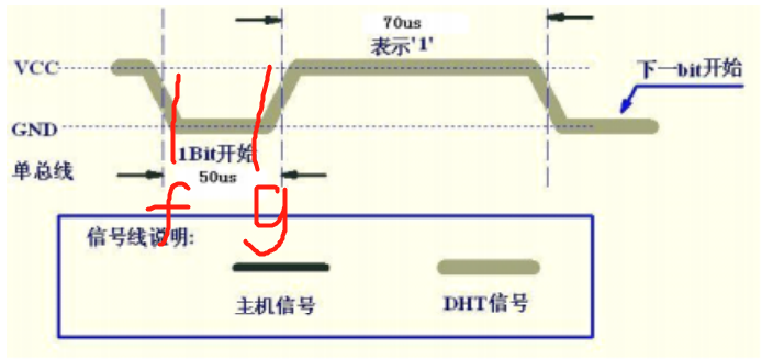 紧接着g点,我们可以看出如果在g点之后26us-28us之间如果为高电平则表示0,在70us间如果为高电平则表示1。那么我们可以判断g点之后50us的状态,如果为低电平则表示0,为高电平则表示1。