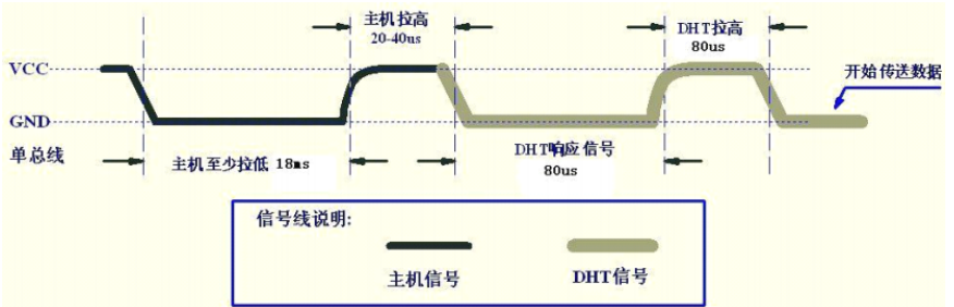 数据传送逻辑 :只有一根数据线DATA,单片机发送序列指令给DHT11模块,模块一次完整的数据传输为40bit,高位先出。